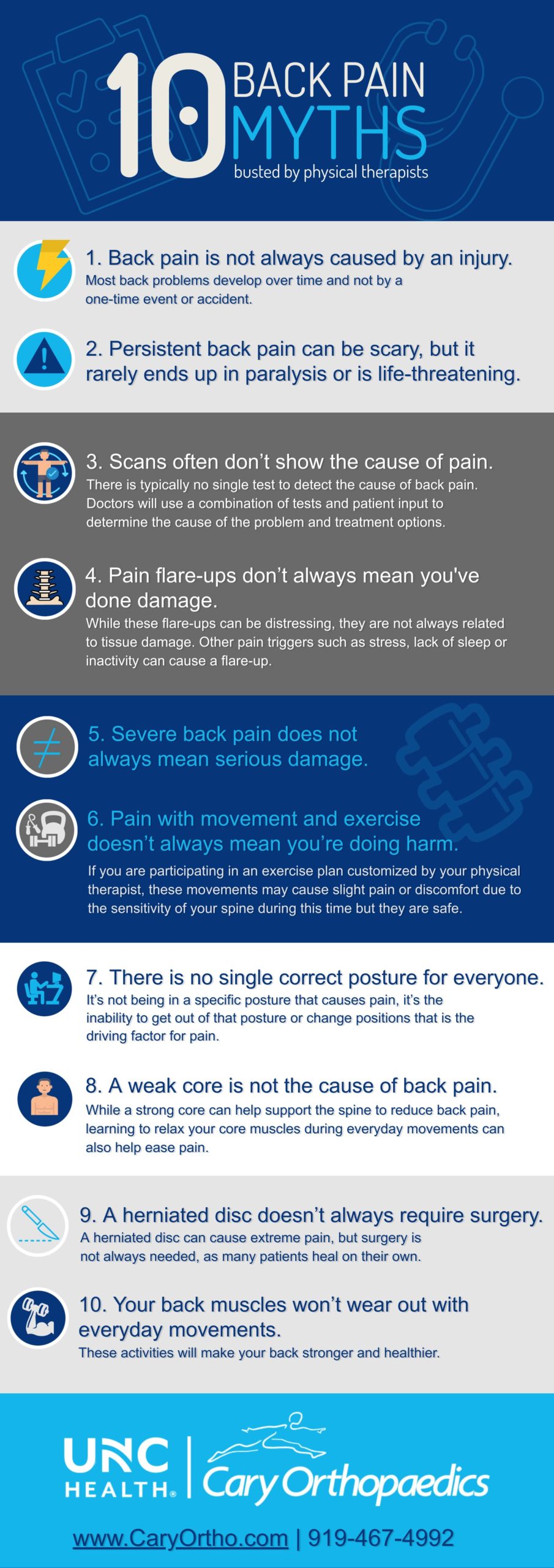 Back pain is an all too common condition for many people. In fact, nearly 65 million Americans reported back pain recently. With millions suffering from back pain, it has turned into the sixth most costly condition in the United States. If you suffer from back pain, you may not know all the facts. Here, our highly skilled physical therapists take the time to bust back pain myths and share their expertise.